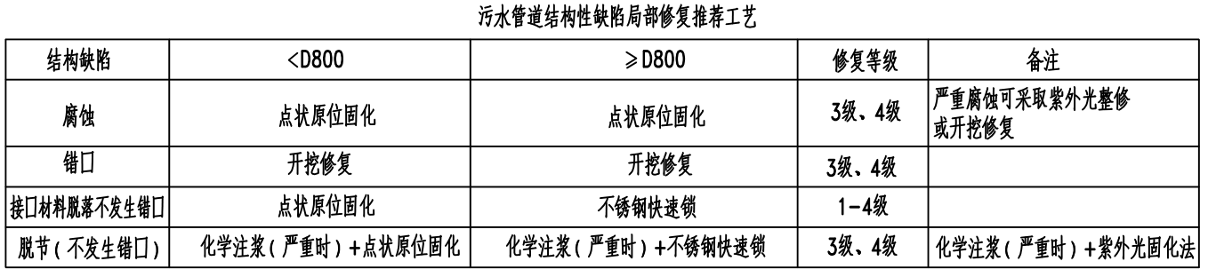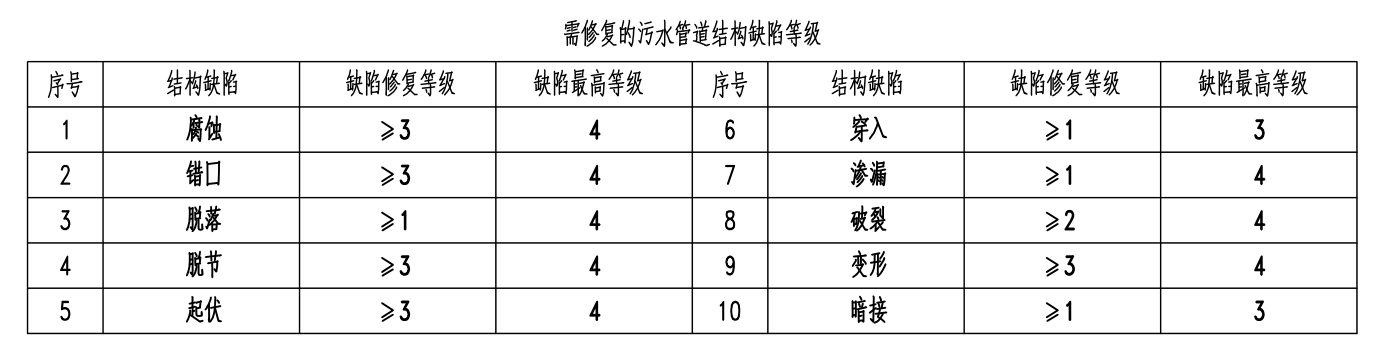 2) 缺陷数量较多、且缺陷级别较严重的管段,宜采用整体修复,可按(需修复的管段纵向缺陷长度之和+需修复的管段环向缺陷数量*1)/管段总长度≥30%的宜采用整体修复(有明确纵向长度的缺陷按纵向长度计算,无明确纵向长度的局部缺陷按1m/处计算),原则上同一管段出现 3 处结构性损坏的,采用整体修复方法。
